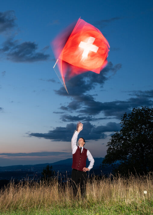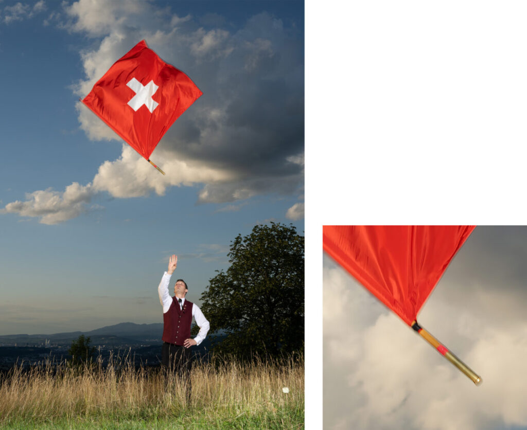 Egy dombon Bázel déli részén, a városra néző kilátással egy zászlódobót (egy tipikus svájci hagyományt és sportot) kellett lefotózni. Így a kamera észak felé nézett, a délutáni nap pedig nyugatról, azaz balról érkezett.